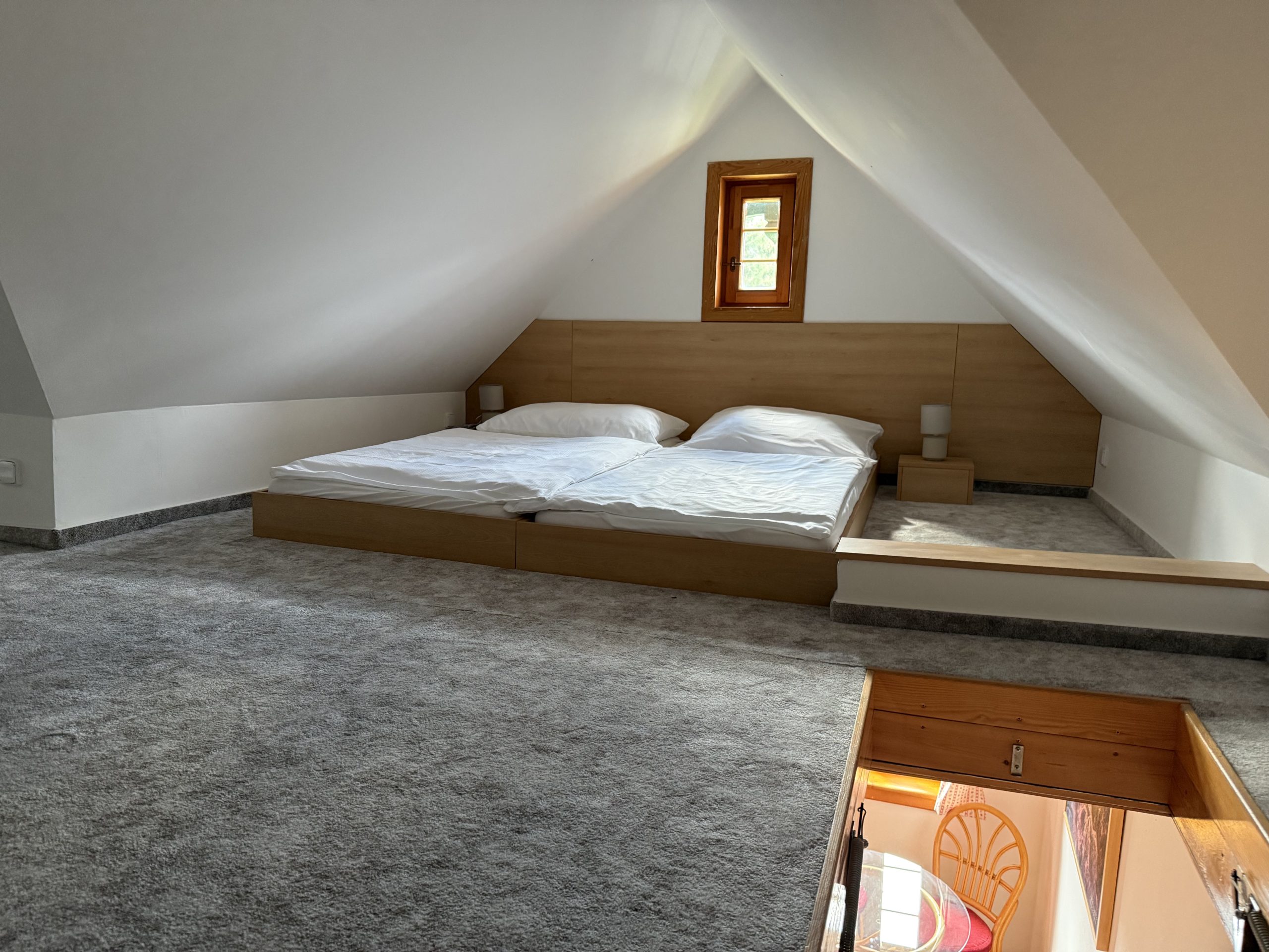 - Ložnice a pokoje: V prvním patře jsou 2 ložnice. První ložnice má jedno dvoulůžko a druhá ložnice má 2 dvoulůžka. V podkroví jsou 4 zdravotní matrace. Možnost využití dětské postýlky.