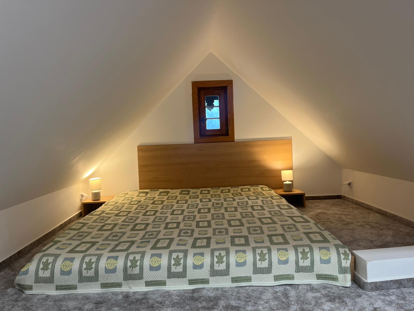- ložnice v patře má velké manželské dvoulůžko, noční stolky a 2 prádelníky. V chladném období je možné k použití přenosné tepelné elektrické těleso.