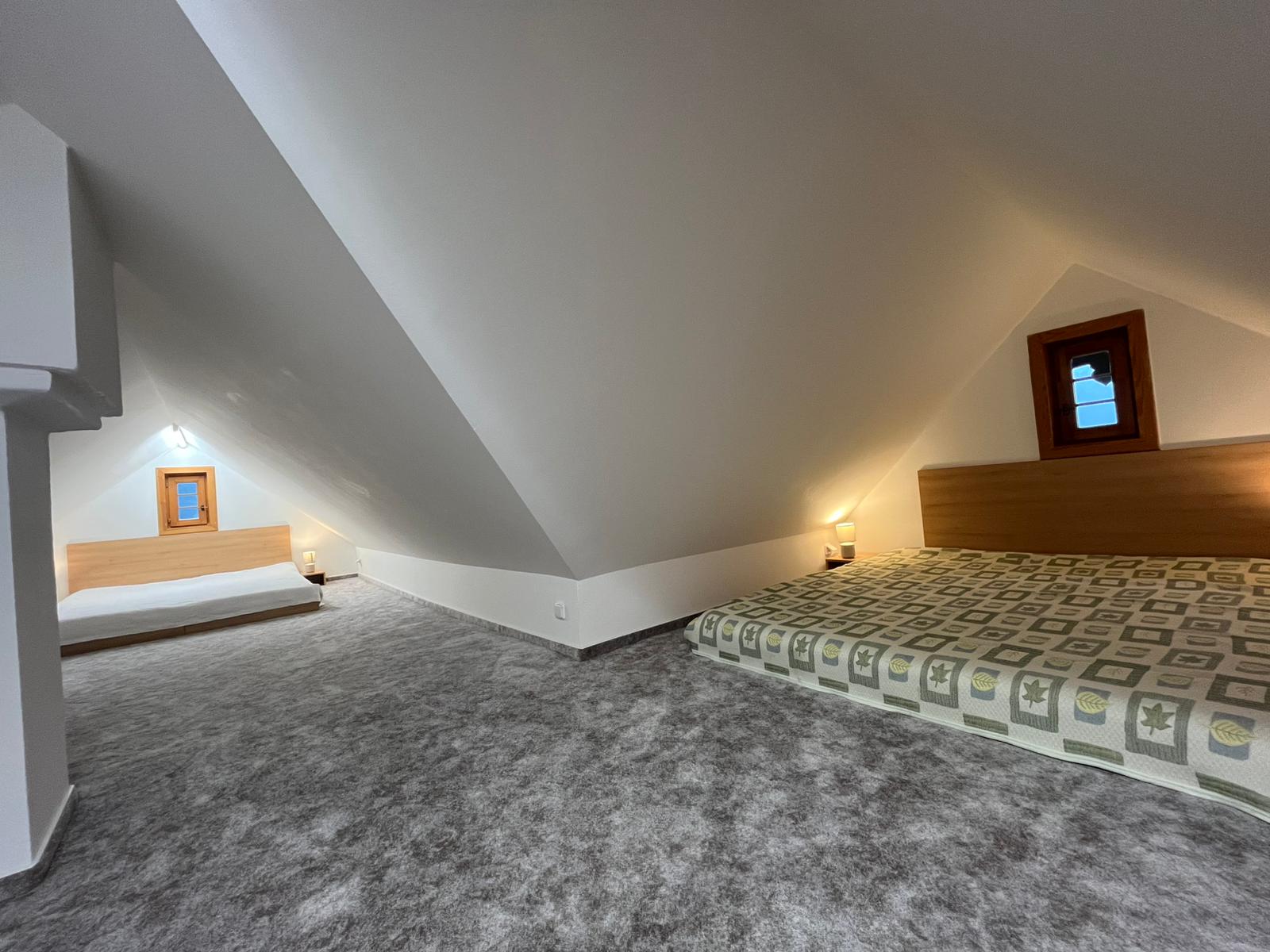 - Podkroví navštívíte sklopnými schody. Spaní v podkroví je kouzelné, v noci ticho a tma tmoucí a slyšíte pouze houkání sýčků a bublání potůčku pod oknem. Je to nejoblíbenějším místem pro děti a Teenagri. Podkroví je pokryté po celé ploše světlým kobercem.